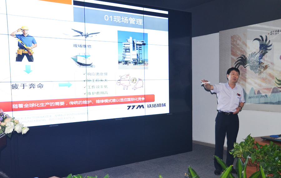 隨后,副總經理高岱樂向考察團展示鐵拓機械遠程服務系統,分享鐵拓機械服務型制造模式思路。他向考察團介紹到,互聯網正在改變中國,同時也在改變世界,鐵拓機械想利用互聯網更好的為客戶做好服務工作。遠程服務系統運營上線,首先改變了傳統的售后服務模式,在機械設備故障發生時,鐵拓機械技術工程師通過系統就可以了解設備使用情況并及時找到問題,在家解決問題,縮短服務時間和成本,為客戶提供便利。同時該系統還兼具預警功能,通過設備大數據分析,對設備核心部件使用情況能夠及時預警,降低設備故障率,降低設備的維護成本。