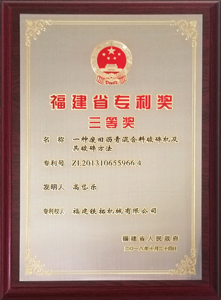 鐵拓機械瀝青路面材料再生關(guān)鍵技術(shù)——破碎篩分榮獲“福建省專利三等獎”