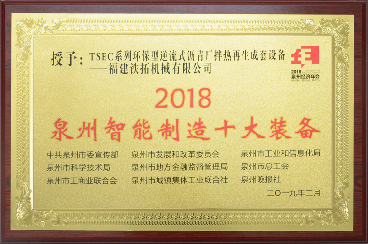 鐵拓機械“拳頭”產品——TSEC系列環保型逆流式瀝青廠拌熱再生成套設備從眾多產品中脫穎而出,躋身“2018年泉州市智能制造十大裝備”榜單。
